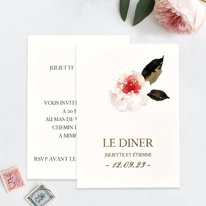 Carton d'invitation avec fleurs vegetales et très romantiques en accord au faire-part de mariage