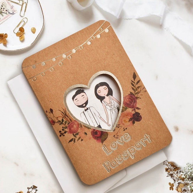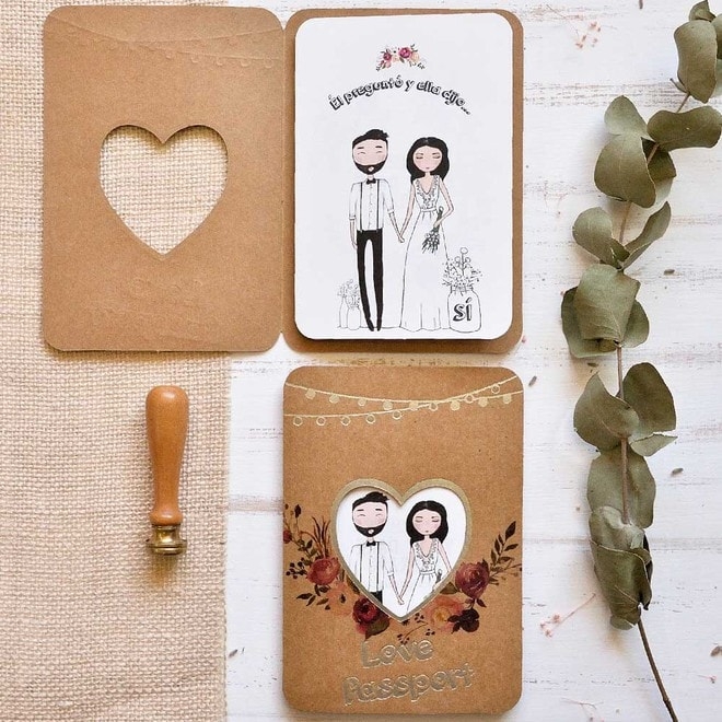 Si pour vous le mariage symbolise le commencement du plus grand et le plus merveilleux voyage, quoi de mieu que choisir ce faire part de mariage.passeport. Composé de : enveloppe, carte extérieure Kraft LOVE PASSPORT et carte intérieure avec les dessins des mariés et pour l'impression des données du grand jour. Dimensions : 11,4x 16,4cm.