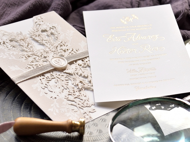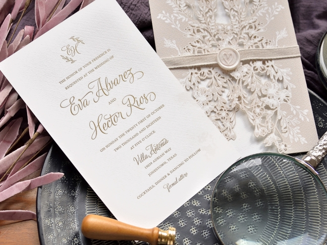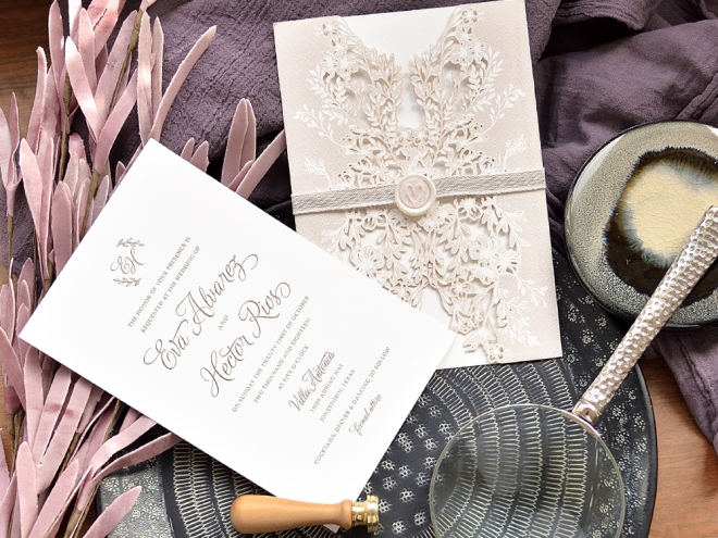 Faire-part de mariage chic et champêtre avec carton. Une élégante pochette romantique et chic thème champêtre fermé par un jolie ruban. Une réalisation délicate pour glisser à l'intérieur le carton d'invitation de vos futures noces.