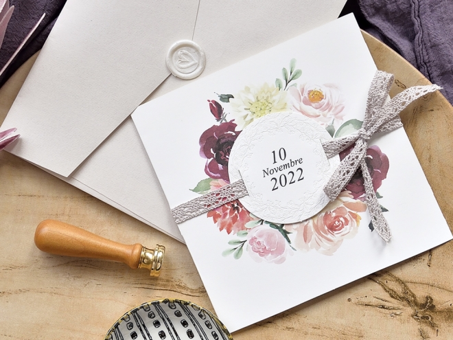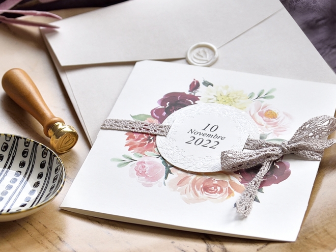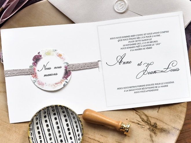 Faites sensation auprès de vos hôtes avec cette composition de motifs floraux. Une délicate couronne fleurie vient enlacer vos deux charmants prénoms pour l'annonce de ce bel évènement. Le tout enlacée d'une douce ficelle assorti accompagné d'une ravissante étiquette. Ce modèle s'harmonisera parfaitement dans un thème de cérémonie nature et champêtre.