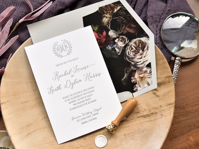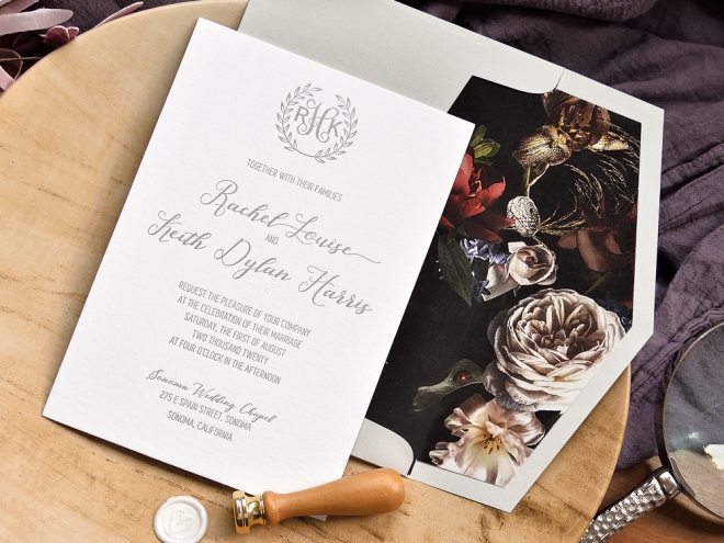 Ce faire-part ce compose de l'enveloppe et du carton. La doublure et le cachet sont optionnels.