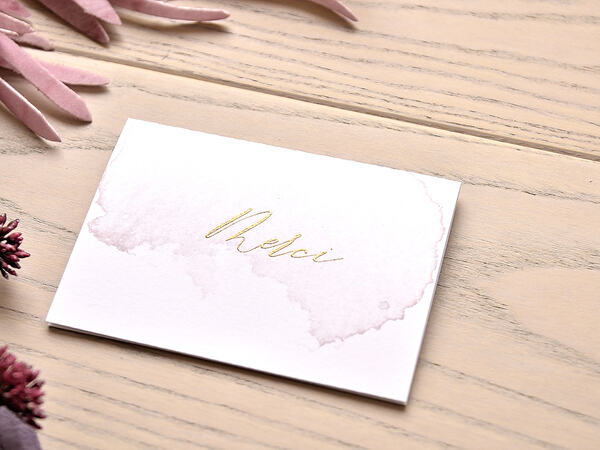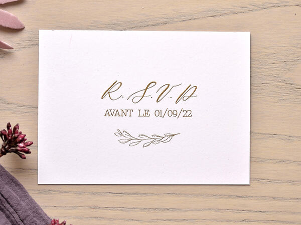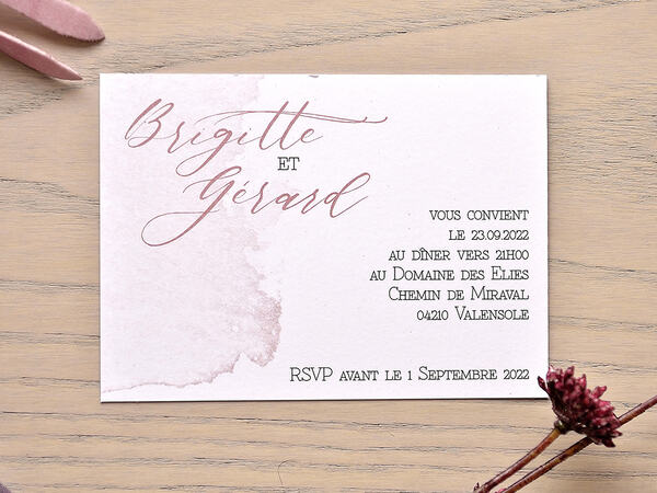 Un faire-part illustré en couleurs rosés et dorés avec enveloppe assortie pour annoncer un mariage romantique. Faire-part de mariage avec photogramme à son intérieur.