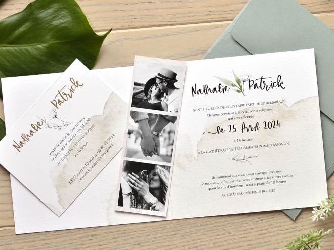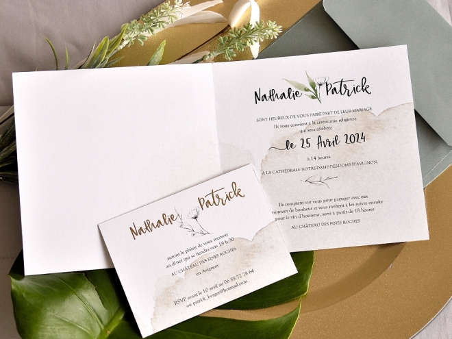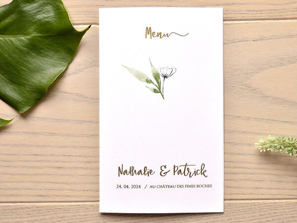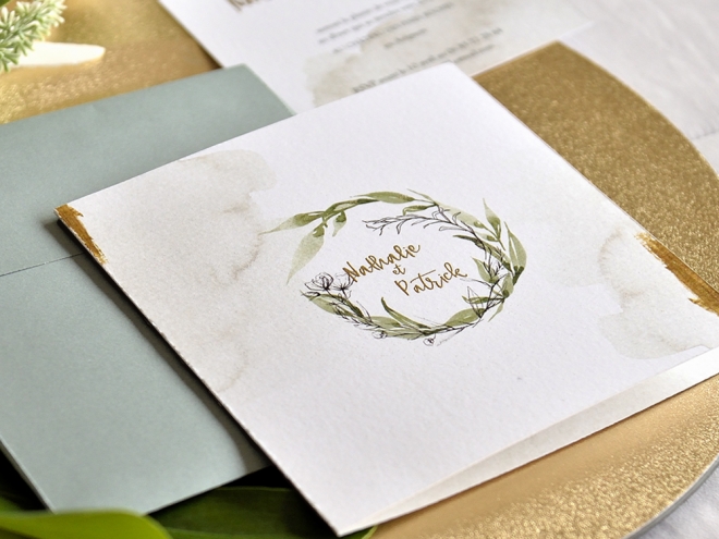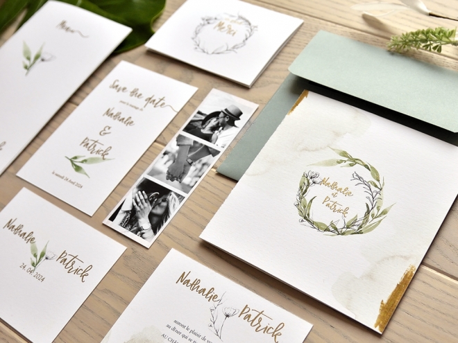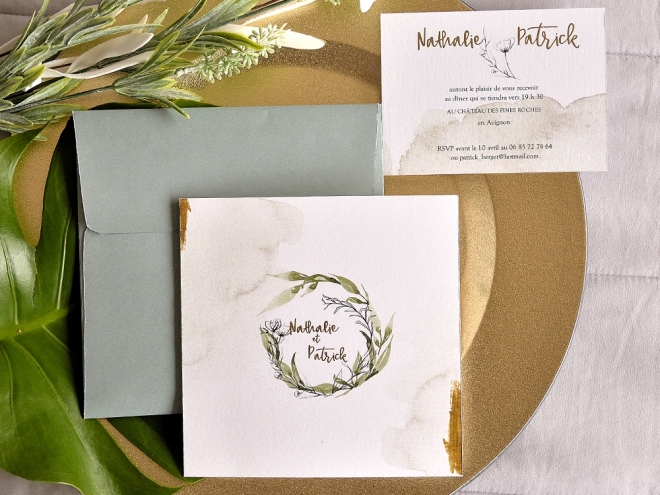 Quoi de mieux que de donner une touche d'espoir à vos faire-parts, pour annocer le plus beau jour de votre vie à votre famille et à vos amis. Les faire-parts avec des feuilles couleur verte subjuguerons vos proches et satisferons tous les amoureux de la nature.