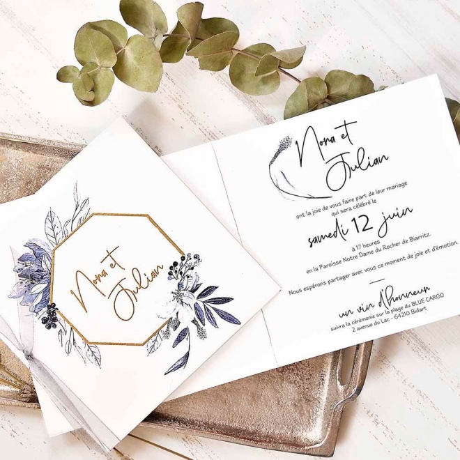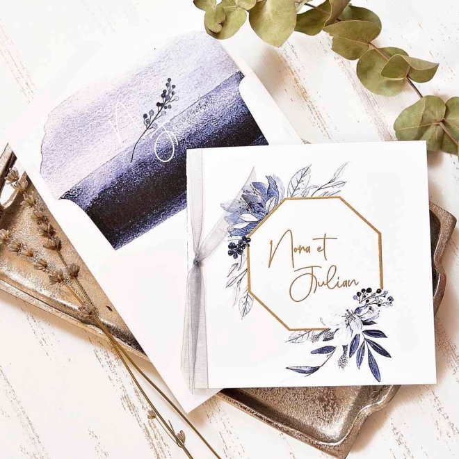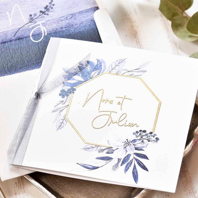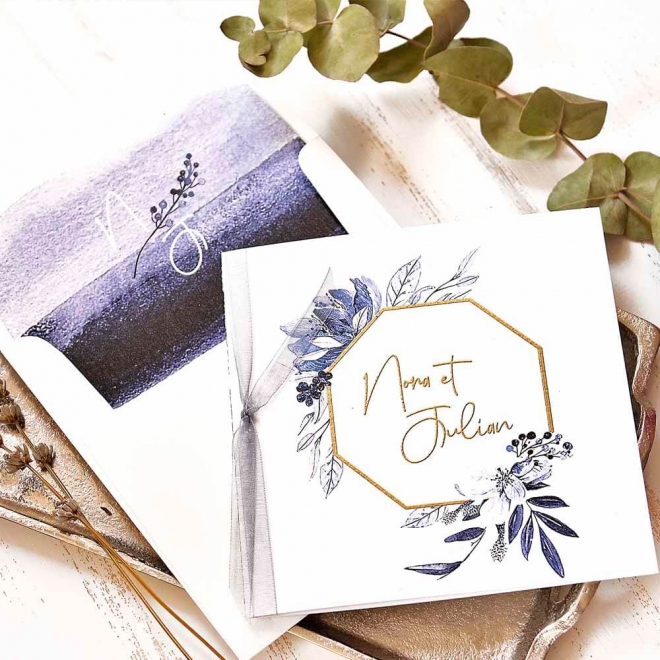 La partie extérieure est décorée de décorations florales en mauve et bleu. Le nom des futurs mariés est imprimé sur une figure géométrique entourées de fleurs. Le côté gauche est décoré d'un ruban assorti. À l'intérieur le texte totalment personnalisable avec les donnés de l'évènement.