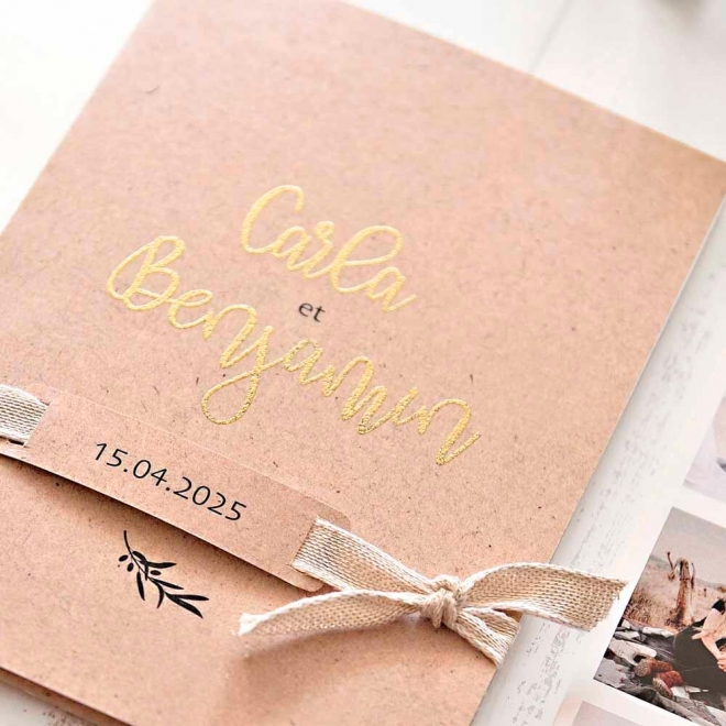 Faire-part de Mariage avec fond en couleur terre. Dans le cas de la photo présentée les noms des futurs mariés sont imprimé en relief et couleur or. Sur le bas des noms une étiquette avec la date de la cérémonie rataché avec une ficelle. À son intérieur et sur le côté gauche, le texte avec les donnés et totalement personnalisable. Et sur la droite, un rabat pour les photos, le carton d'invitación ou celui de confirmation.