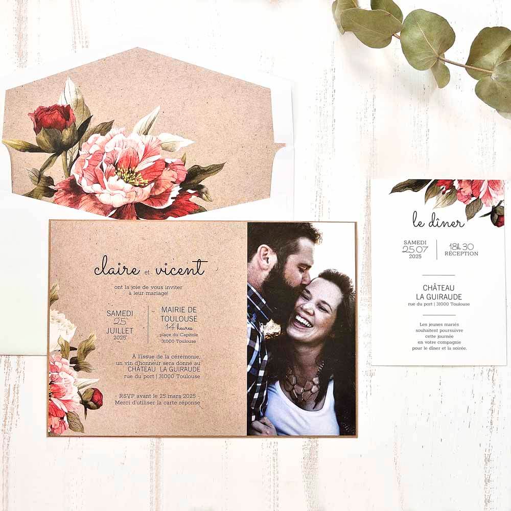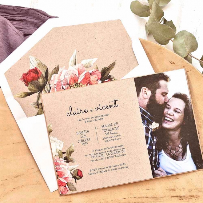 Faire-part de mariage vintage. La carte est décorée de fleurs. Le prix comprend : l'invitation, l'enveloppe et la photo. La doublure de l'intérieur de l'enveloppe est facturée séparément et par unité. Si vous êtes intéressé, veuillez l'indiquer dans vos commentaires de commande.