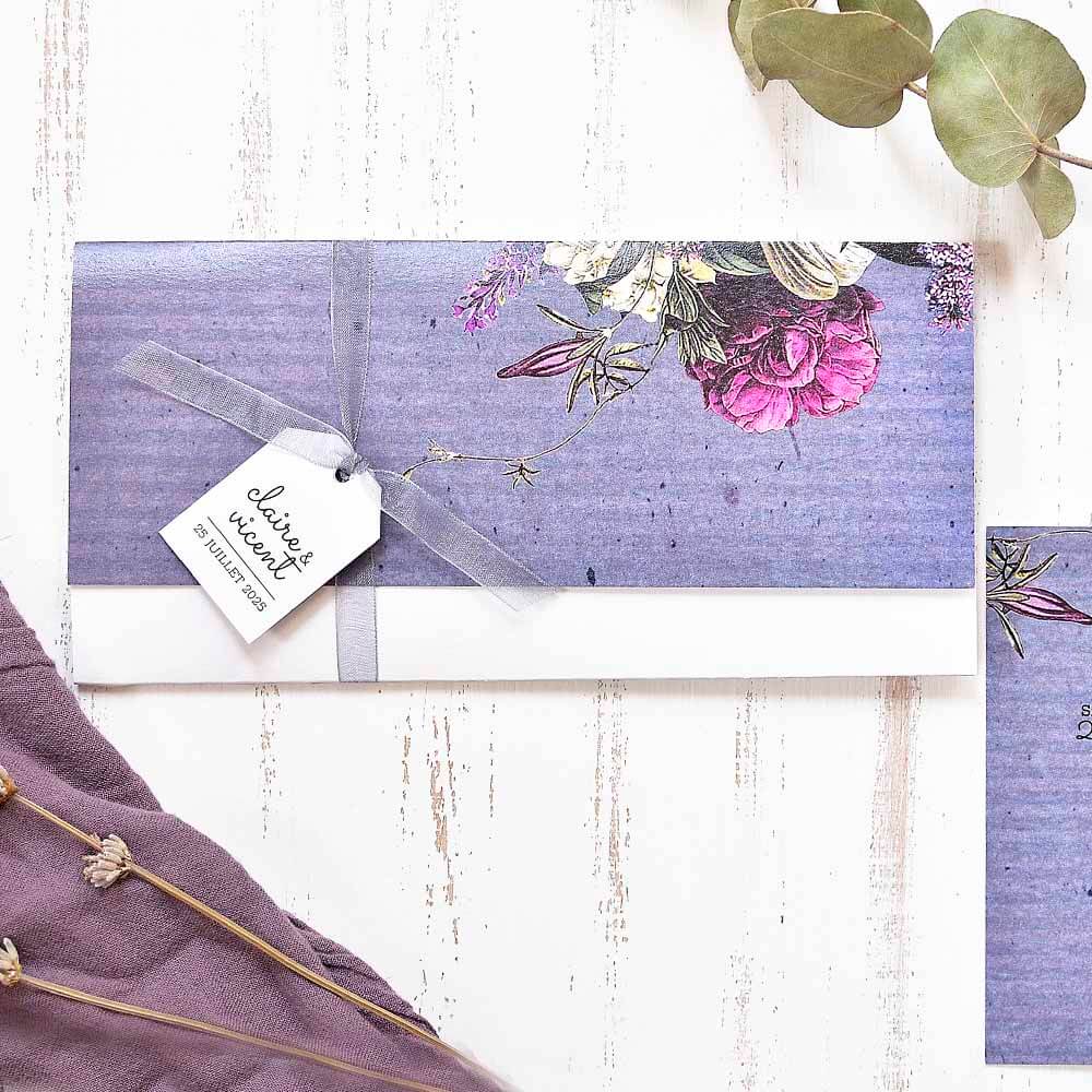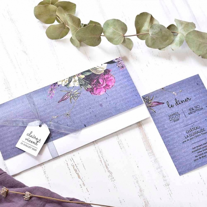 Faire-part en tons violets et blancs. La partie extérieure est décorée de fleurs roses et blanches. En ouvrant le faire-part vous découvrirez le texte entièrement personnalisable et une jolie photo des futurs mariés sur un fond blanc.Ce faire-part ne peut être imprimée que sous forme numérique.