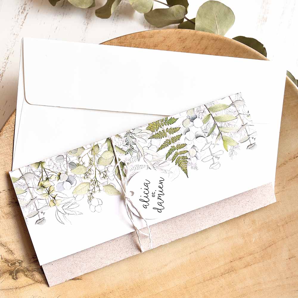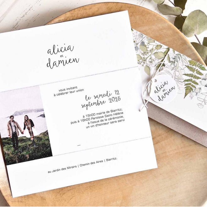 Faire-part de mariage pour les amoureux de la nature. La couverture se distingue par ses arbres colorés. À son intérieur comprend une photo des futurs époux et le texte entièrement personnalisable. Le faire-part est fermée par une ficelle et une étiquette avec le nom du couple ou la date de la cérémonie.