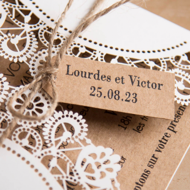 Ce Faire-part de mariage ciselé est composé d'une carte extérieur couleur crème avec finitions dorées et en forme de dentelle découpée au laser pour apporter un éclat au faire-part. À son intérieur la carte en papier kraft pour l'inpresion de votre texte totalment personnalisable. Le tout entouré d'une ficelle avec une étiquette sur laquelle vous pouvez indiquer les prénoms des mariés ou la date de la célébration. L'enveloppe assortie est incluse.