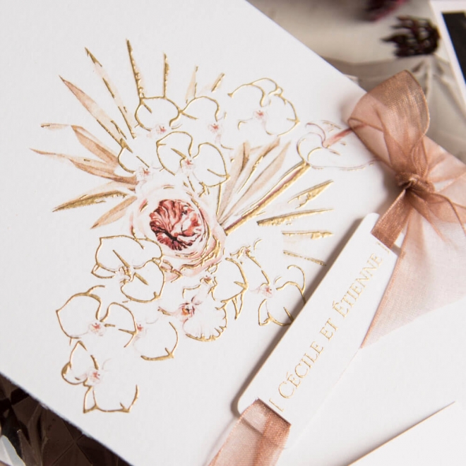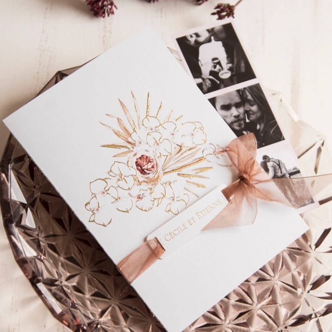 Sur la couverture des feuilles dorées imprimées en relief et une fleur au centre. À l'intérieur le texte personnalisé à votre gout et un photogramme avec trois de vos plus belle photos. Le tout entouré d'un ruban avec une etiquette avec vos noms.