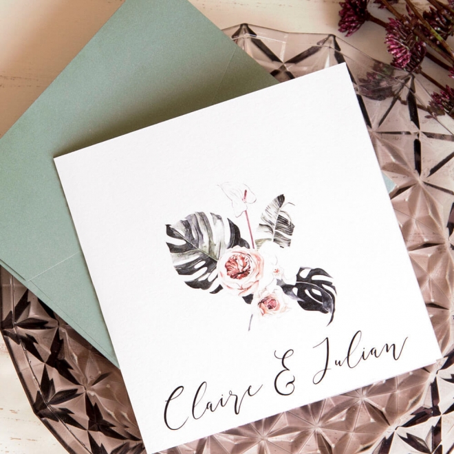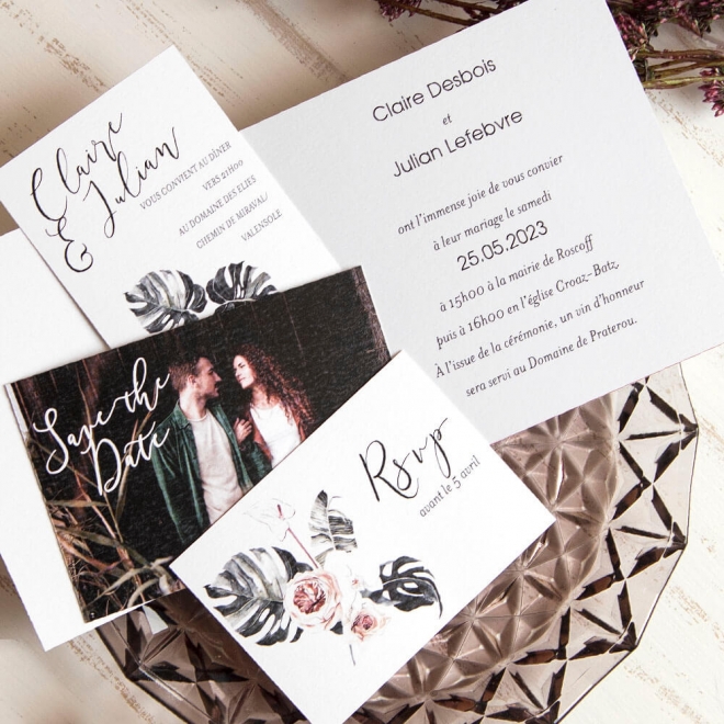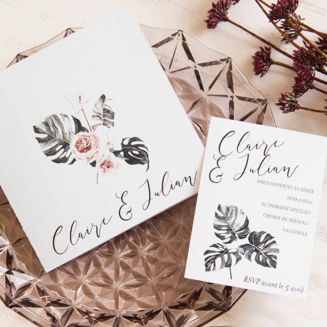 Faire-part de Mariage pour les amoureux de la nature. Sur la couverture d'élégantes feuilles desquelles naissent de douces fleurs. À son intérieur le texte personnalisé à votre gout. Le tout dans une enveloppe assortie. ce faire-part avec feuilles et fleurs vous plongera directement dans la nature.
