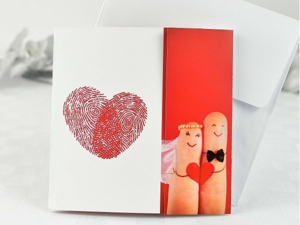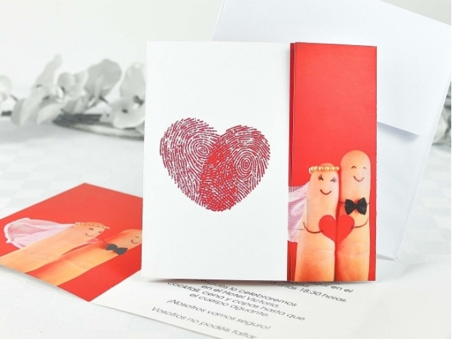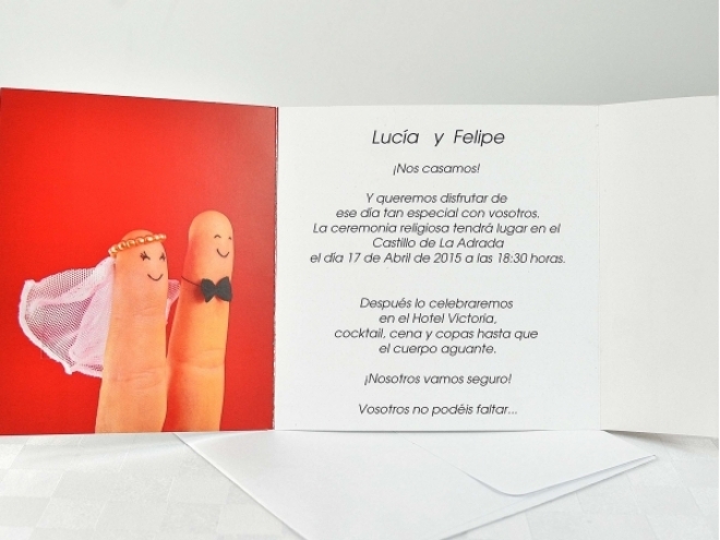 Faire-part de mariage original sur un thème humoristique et actuel. Vous trouverez deux élégants doigts prêts pour le mariage. A son intérieur tous les détails de l'évènement. L’enveloppe est assortie au faire-part.