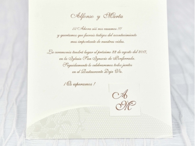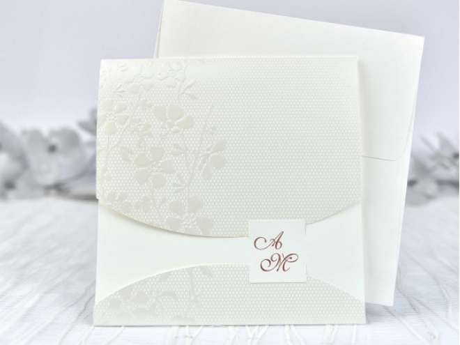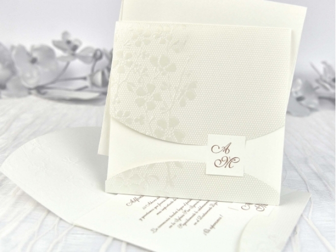 Faire-part mariage dans des tons clairs pour les mariés avec un esprit naturel. A l’intérieur du faire-part se trouve une petite étiquette sur laquelle vos initiales seront imprimées. A l’intérieur du faire-part, deux rabats ouverts pour afficher le texte avec les détails de la cérémonie