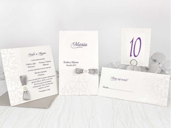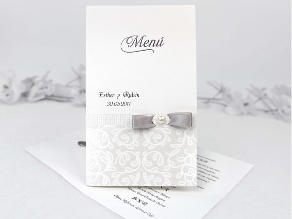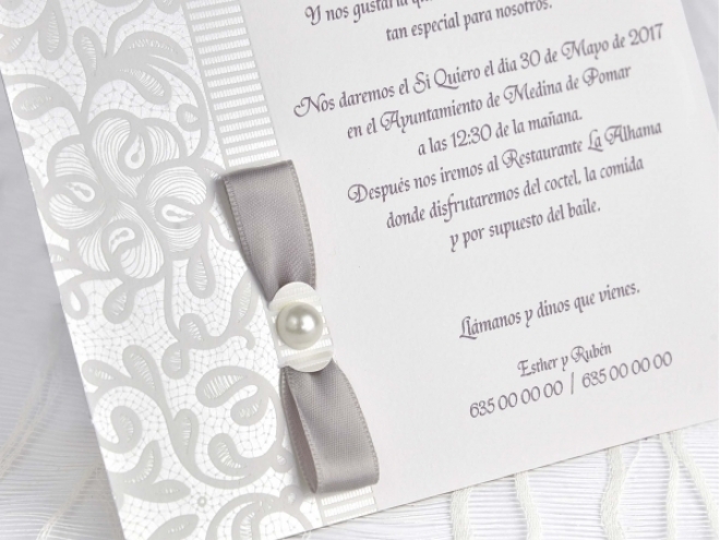 Faire-part de mariage classique. En couleur argent et blanc cassé avec un ruban gris perlé qui l'entoure. Enveloppe incluse et assorti en gris.
