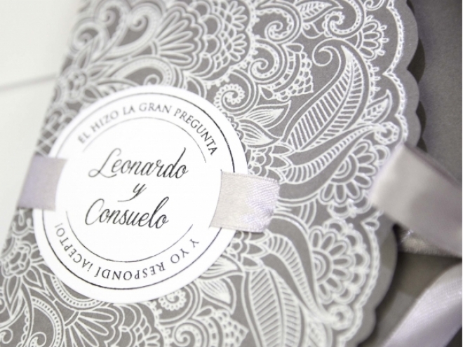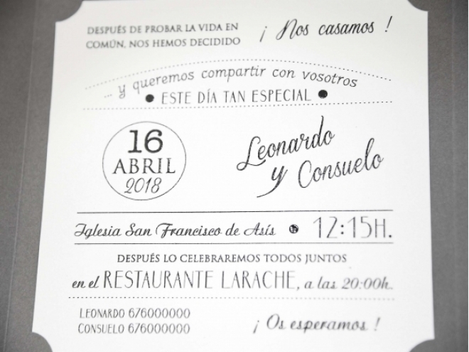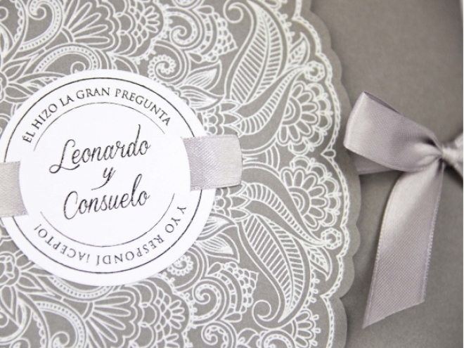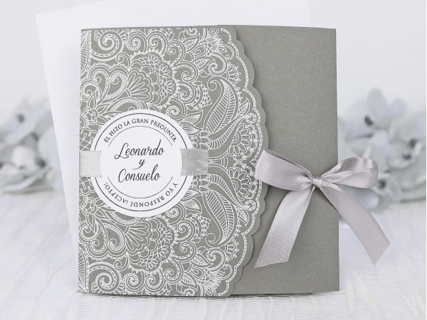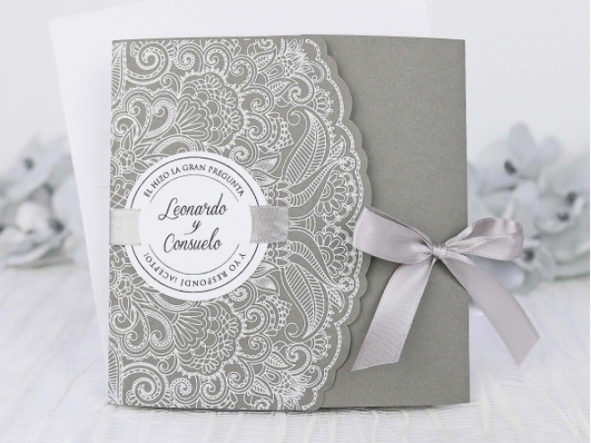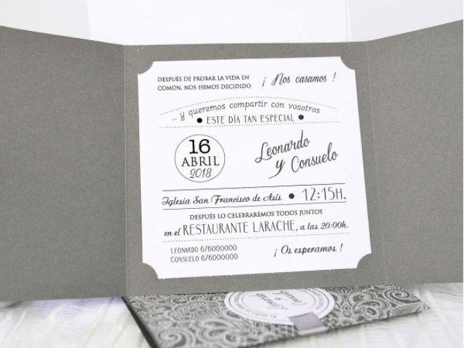 Élégant faire-part en couleur grise. Composé de pièces séparées : ruban gris perle (la couleur du ruban ne peut pas être changée), carte blanche avec l'impression du texte du mariage + cercles avec les noms des mariés et une enveloppe blanche. Mesures : 14'9 cm X 14'9 cm. Le faire-part peut être imprimé en numérique ou en relief. Le résultat est magnifique avec l'impression noire en relief (R1).