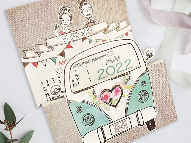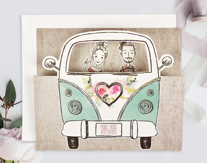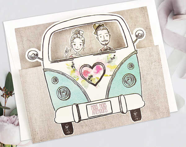 Mettez tout le monde dans le van, on part au mariage! Avec ce faire-part mariage vintage, vous surprendrez sans doute vos invités.