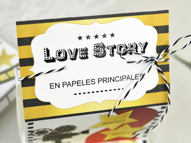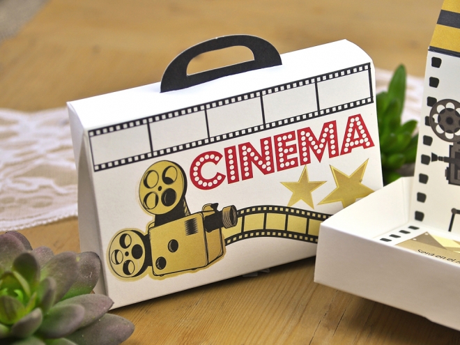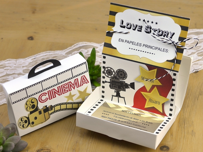 Faire-part de mariage original plié en accordéon autour de l'univers du cinéma. Vous retrouverez différents éléments propres à ce thème tel qu'une caméra, pellicule d'un film et les étoiles dorées contenant les noms des futurs mariés. Votre texte suivi de vos coordonnés apparaitrons à l'intérieur du faire-part plié en accordéon. Le tout dans une petite valise.