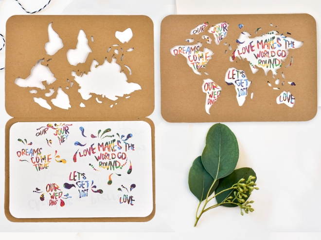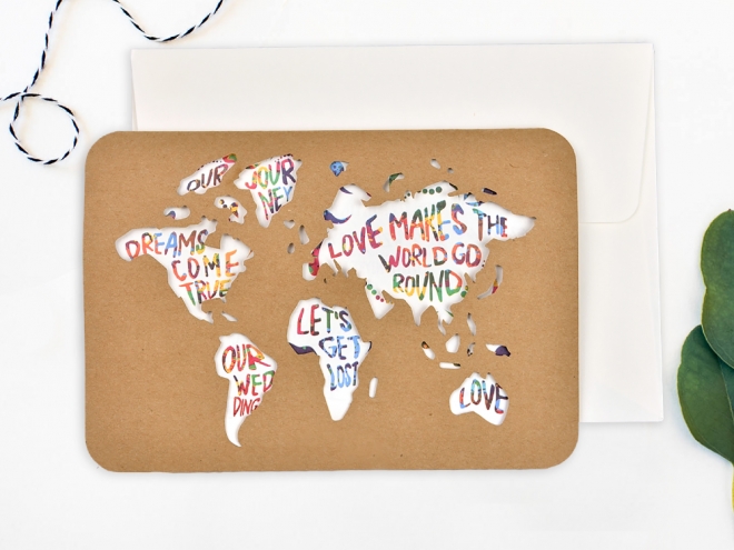 Faire-part de mariage très original avec la carte du monde découpée au laser. Tous les continents sont recouvert de belles phrases d'amour. Le texte intérieur est entièrement personnalisable.Nous vous recommandons de choisir l'impression en relief noir (R1) pour le texte.