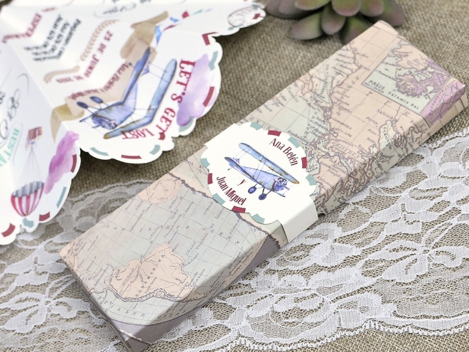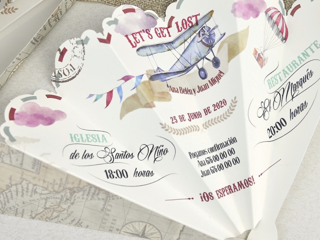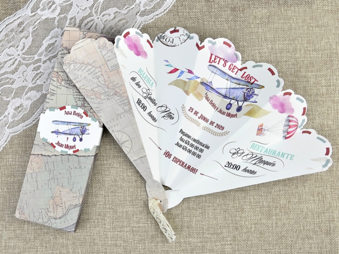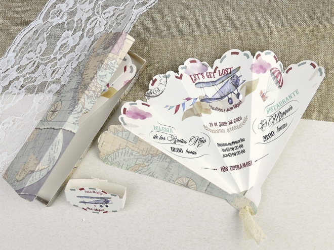 Faire-part mariage original. Boîte originale allongée avec le fond d'une carte du monde qui contient un éventail avec le texte du faire-part. Au centre se trouve le dessin d'un petit avion et d'une montgolfière. Les nuages sont peints en rose. Un ruban de macramé forme l'éventail et la boîte avec un petit avion avec le nom du couple imprimé.