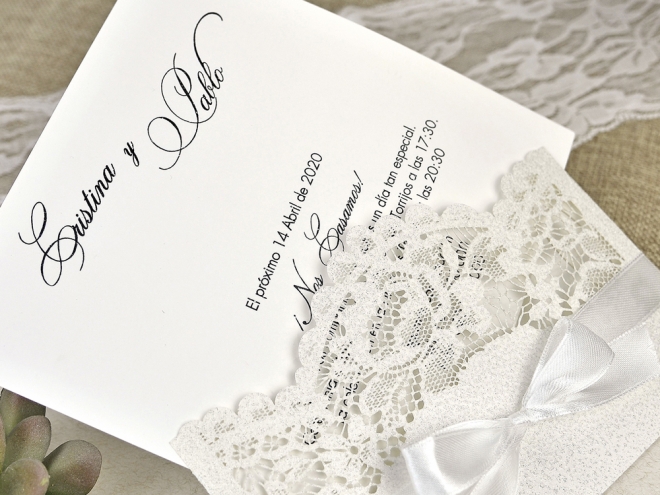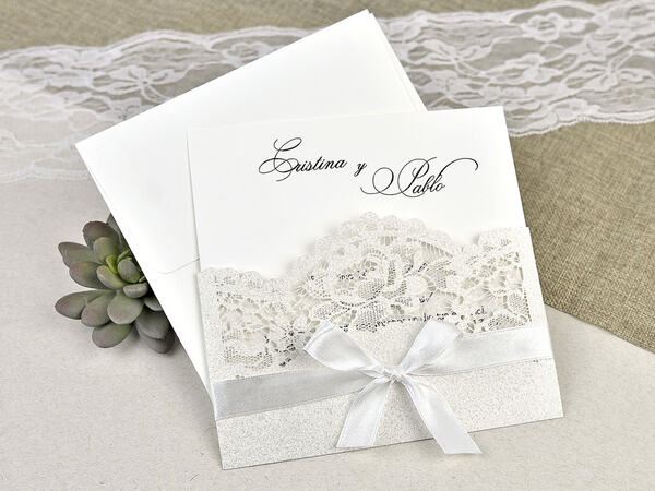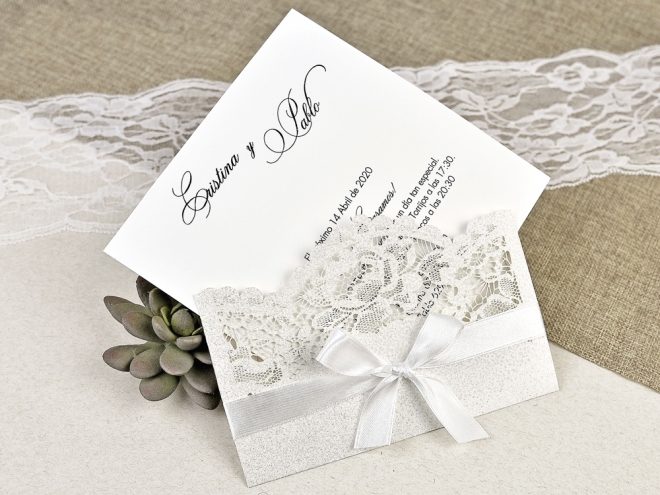 Faire-part mariage carré avec une décoration en dentelle à l'extérieur, peint avec des paillettes et un ruban blanc entourant l'invitation. Invitation très romantique et élégante contenant une carte avec le texte de la célébration.