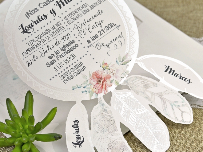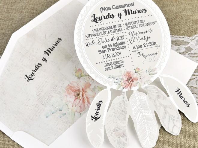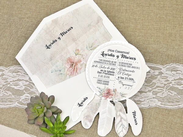Agissant comme un filtre, il capte les songes envoyés par les esprits, conserve les belles images de la nuit et brûle les mauvaises visions aux premières lueurs du jour. Il a des tons doux et chaleureux, livré avec une enveloppe en couleur crème qui peut se compléter avec un intérieur d’enveloppe décoré sur lequel on peut imprimer les prénoms des maries.