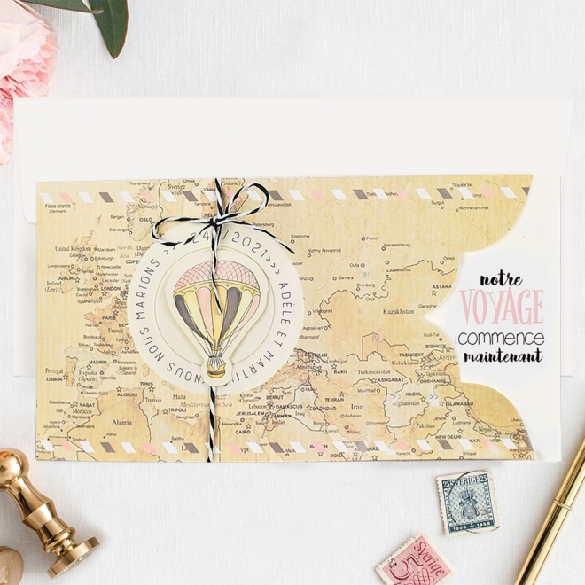 Ce faire-part vous offre plusieurs options sous la forme d'un autocollant principal : un ballon, un avion, une camionnette ou un vélo. Il est idéal pour les mariés aventuriers.