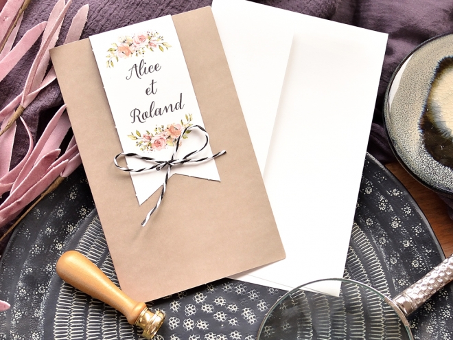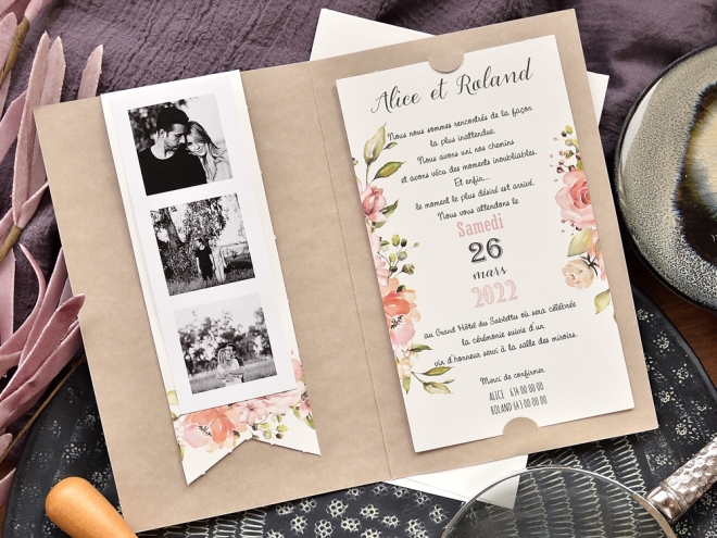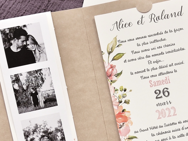 Il se distingue avec un bandeau vertical avec des motifs floral pour imprimer les prénoms des futurs mariés. A l’intérieur du faire-part, le côté du bandeau pour les 3 photos et sur le côté droit le texte annonçant le mariage soutenu avec deux petits rabats latéraux.