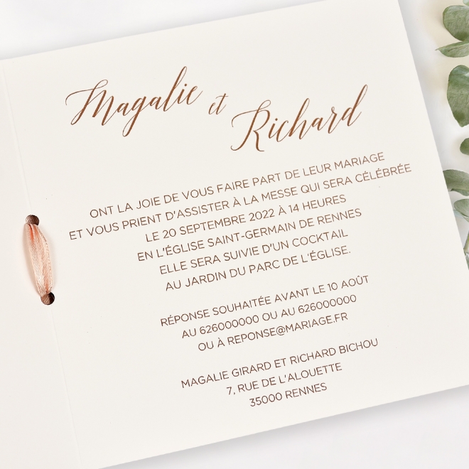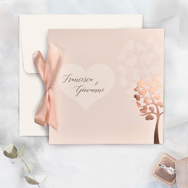 Faire-part de mariage très original avec un arbre avec des feuilles LOVE. Ce faire-part carré et couleur rose à l'extérieur qui est mis en valeur avec son intérieur in couleur écru. Par contre, l'envellope est blanche. Faire-part pour les plus romantiques.