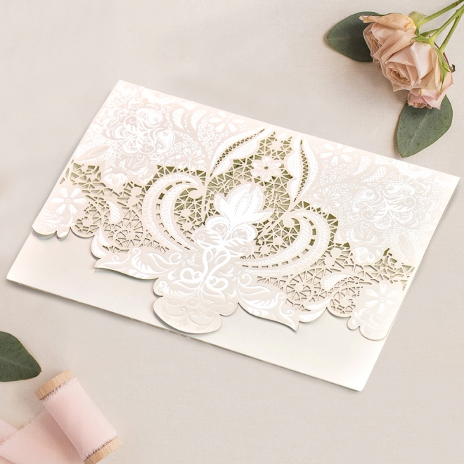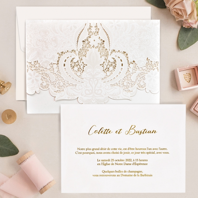 En couleur crème, ce faire-part se distingue par le précieux dessin en découpé laser. Le texte du faire-part est imprimé sur une carte qui va à l'intérieur du faire-part.