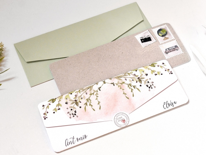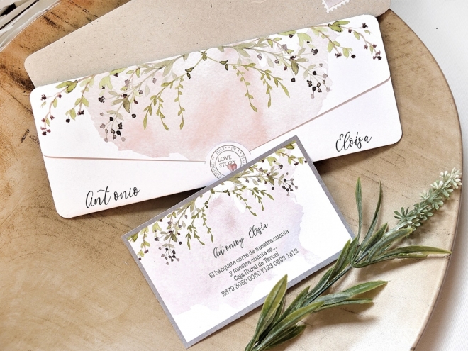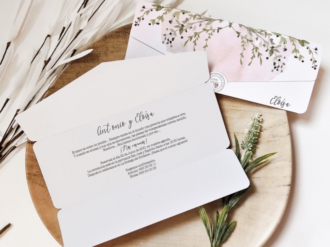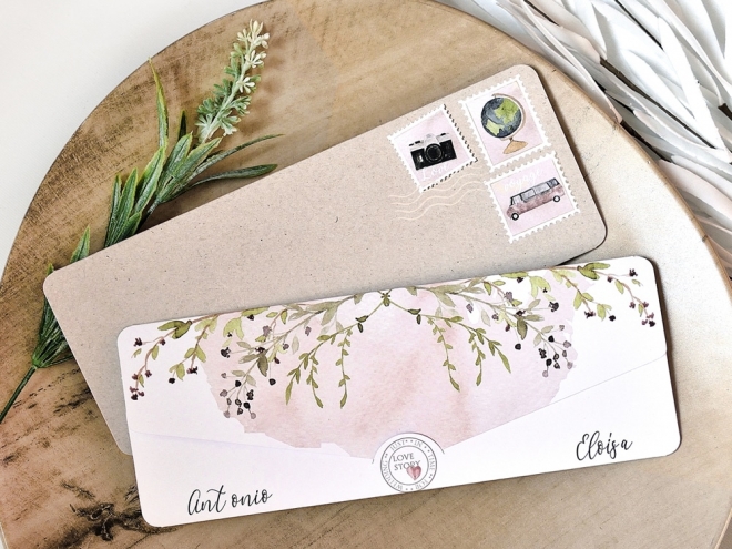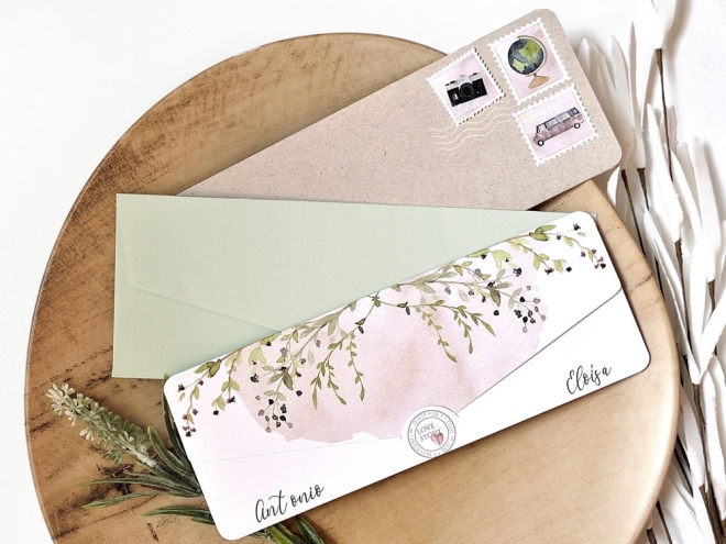 Faire-part Mariage très originale avec des ramifications sur le dessus du faire-part qui démontrent la croissance de votre amour, étape à étape. Ce faire-part s'ouvre avec deus onglets ou vous trouverez à son intérieur le texte personnalisé de votre lien. Au dos du faire-part, trois timbres postaux sont déssinés.