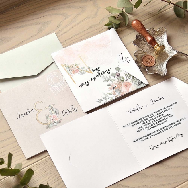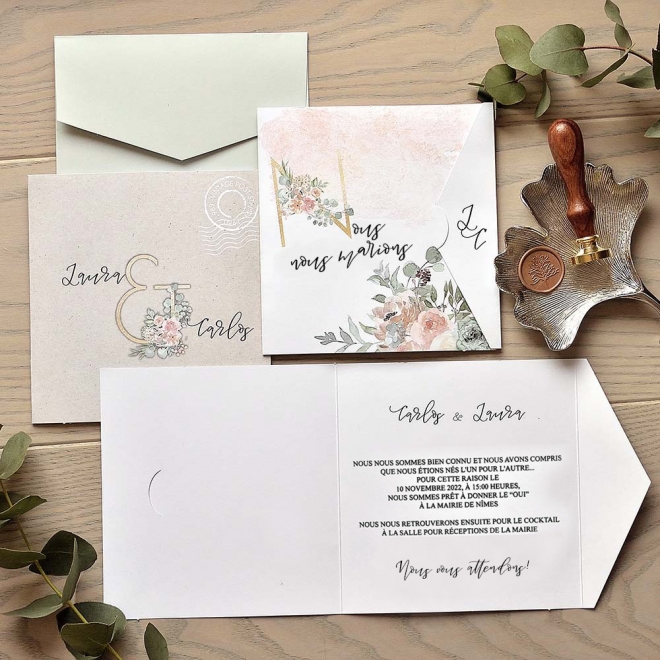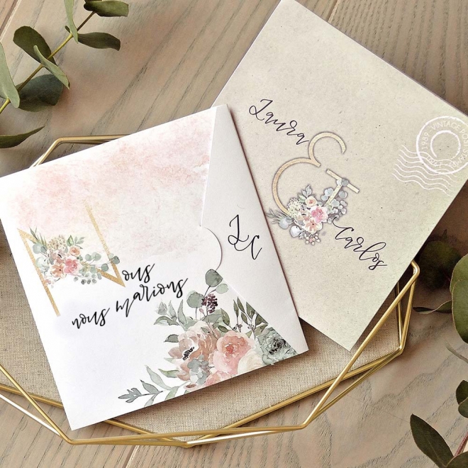 Faire-part de Mariage avec des finitions dorées pour donner une touche de sophistication. Si vous avez pensé à un faire-part différent et original, celui-ci est le vôtre! Impressions de fleurs en tonalités chaleureuse. Vos initiales seront imprimées sur le rabat fermé avec un onglet. L'enveloppe est incluse dans le prix du faire-part.Nous personnalisons votre faire-part de mariage toujours imprimé avec un papier de qualité. L’or est symbole de raffinement qui ferra ressortir l’annonce de votre union.