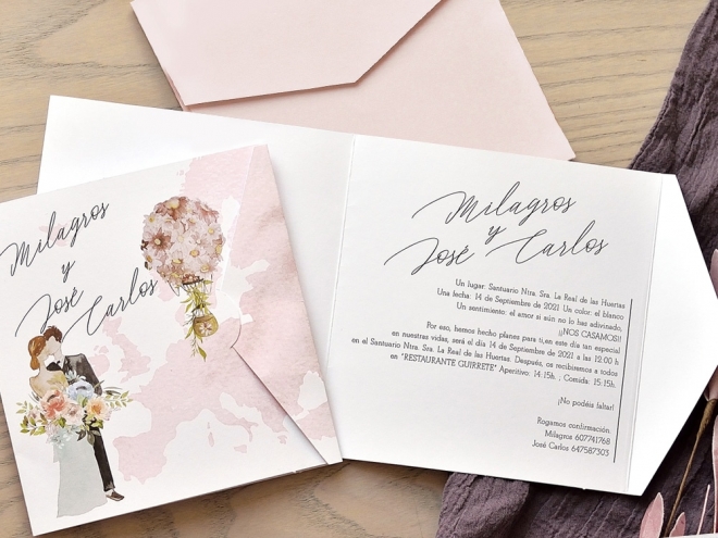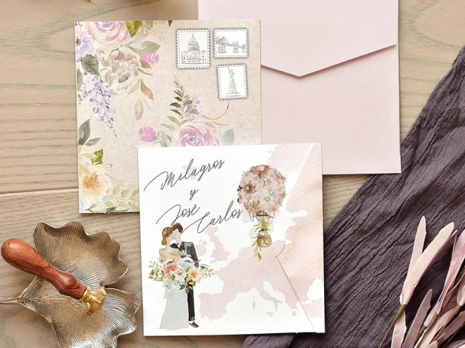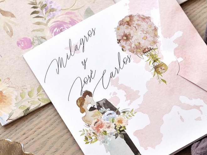 Faire Part Mariage pour les mariés qui veulent faire le tour du monde. Dessins sur la couverture avec une belle finition aquarelle et vos noms imprimés. En ouvrant le faire-part, vous découvrirez les détails du jour de votre mariage.