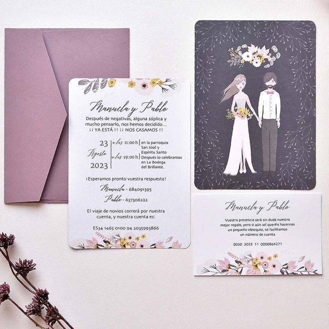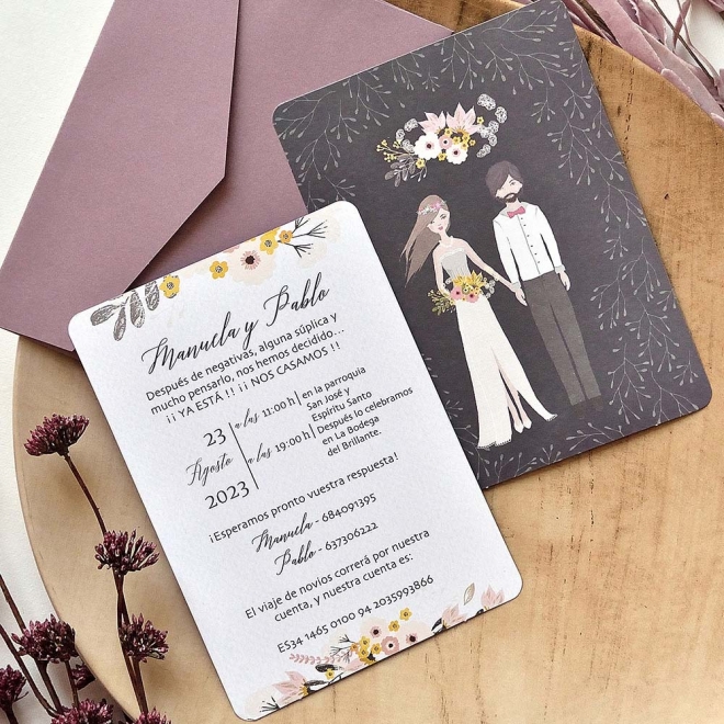 Faire-part de mariage original avec un dessin de deux migons amoureux sur la couverture, sur laquelle vous pouvez imprimer vos noms. Le texte du lien sera imprimé au verso de celui-ci sur un fond clair avec des ornements floraux. L'enveloppe est comprise dans le prix.