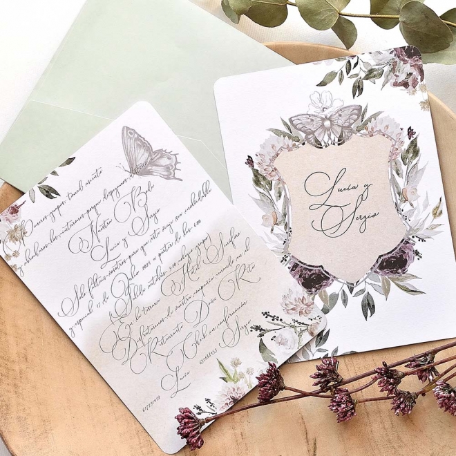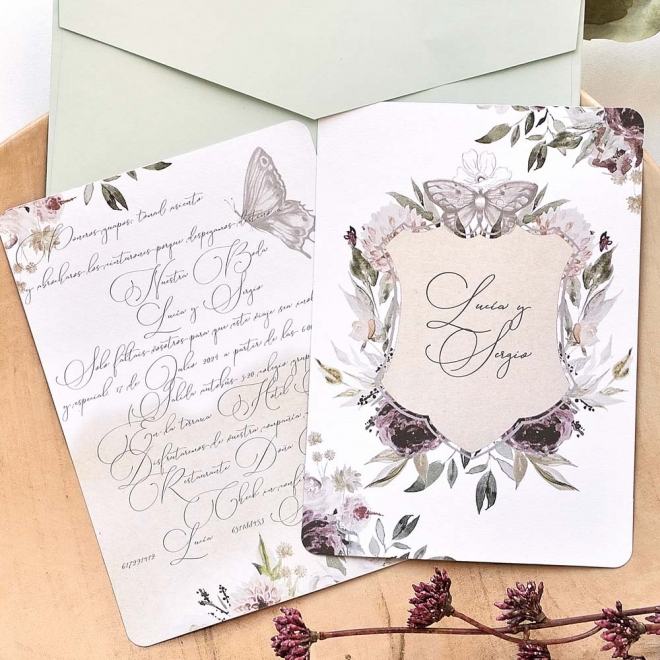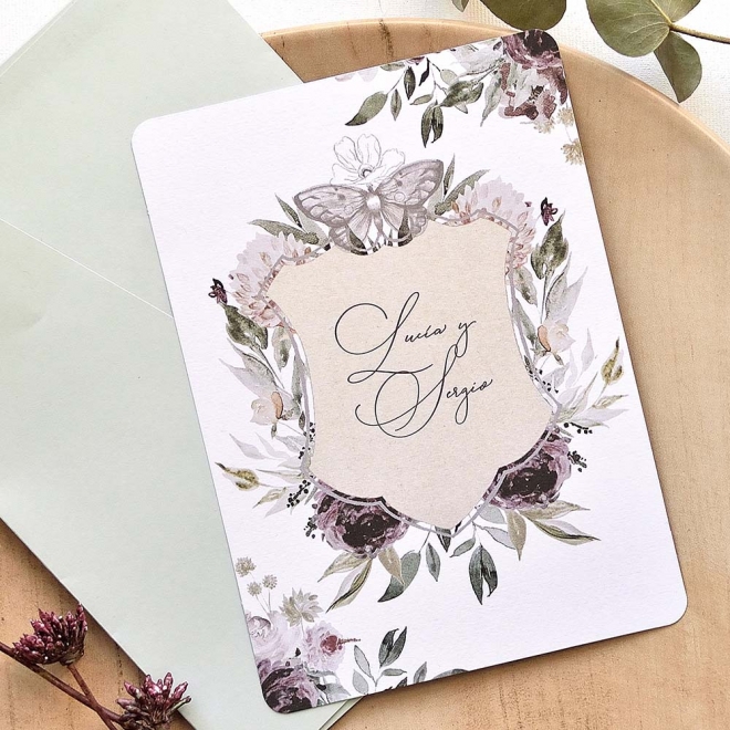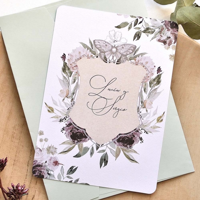 Faire-part de mariage en ligne avec des détails de fleurs au centre qui mettent en évidence les noms des mariés. Au verso, le texte avec les données de votre mariage sera imprimé sur un fond floral et rustique. L'enveloppe est comprise dans le prix du faire-part.