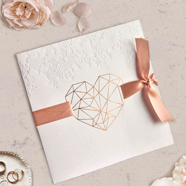 Faire-part de mariage romantique 39851. Pour sceller votre amour pour toujours, voici un faire-part de mariage des plus romantiques ! Un élégant cœur doré, en symbole de votre amour, compose cette création. Votre entourage sera séduit par tant de raffinement. Se compose du faire-part, ruban et enveloppe.