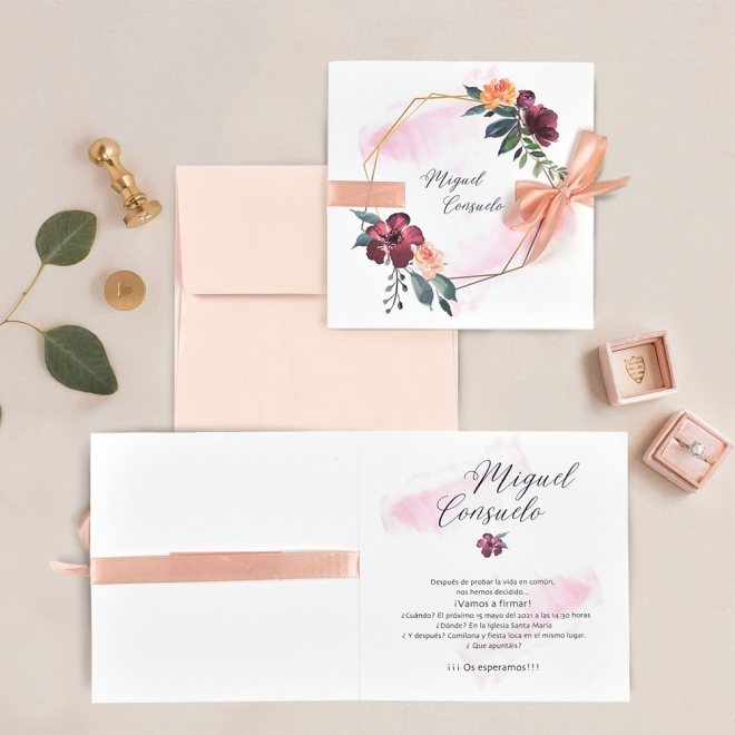 Faire-part carré avec une couverture très originale décorée avec des fleurs en différentes nuances. Le texte peut être personnalisé. Entouré d'un ruban en couleur rosée. Faire-part très romantique.