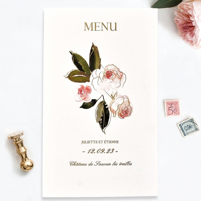 Menu mariage très romantique avec fleurs et decoupages de couleurs en accord a votre faire-parts mariage.